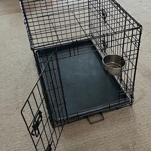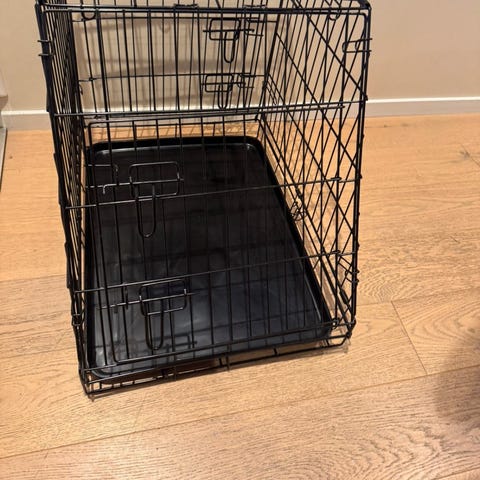 Hundebur i metall med uttakbart bunnbrett i plast. Det er utstyrt med håndtak på toppen for enklere forflytning og flere luker med låsemekanisme på sidene. Egner seg til bruk i hjemmet, på reise eller som hvileplass for hund eller katt