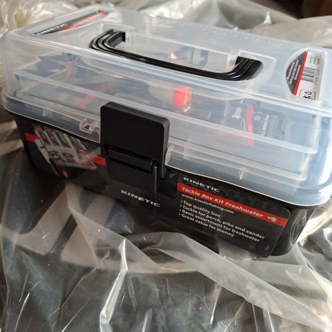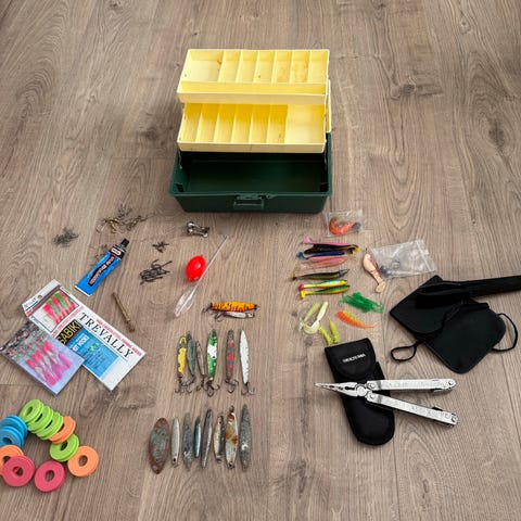 Inneholder ulike agn, kroker og annet tilbehør for fiske.