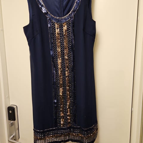 Zara festkjole for dame i størrelse M. Modellen har lange ermer, dyp v-utringning med jakkeslag og lett drapert effekt bak på skjørtet. Stoffet i velour har en lett glitrende overflate som gir en diskret skinnende effekt.