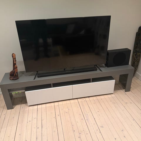 IKEA tv-benk med to skapdører og en skuff, myktlukkende, 180 cm bred. Stammen og fronter er malt i henholdsvis Jotun Soft Touch og Dempet Sort.