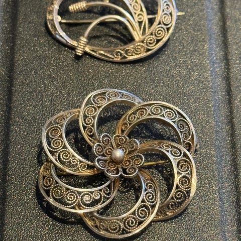Alle deler er stemplet og laget av ekte sølv. God vintage stand med normal bruksslitasje. Perfekt til bunad eller som samlerobjekt.