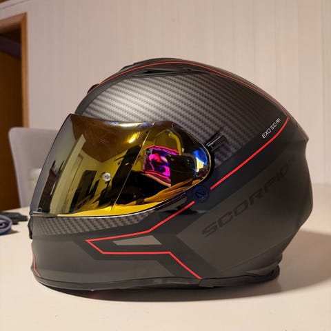 Scorpion Exo 1400 Air mchjelm i svart og hvit med karbonfinish. Hjelmen har klart og sotet visir med Pinlock og luftesystem på topp og hakeparti. Justerbar ventilasjon og aerodynamisk utforming.