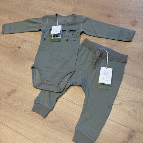Veldig pent brukt ull med bambus innside fra Hust & Claire str 80. 3 bukser i brun, beige og navy og 2 bodyer i blå og beige. Ingen anmerkinger ✨