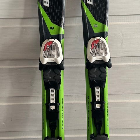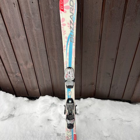 Alpinski med integrerte bindinger. Skiene har hvit og flerfarget toppside med grafisk mønster og mørk såle. Bindingene er montert på ski og har justerbar hæl- og tådel. Egner seg til vanlig alpinkjøring i preparerte bakker.