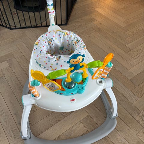 2-i-1 hoppehuske fra Baby Einstein med femten aktiviteter med tre læringsmoduser som barnet ditt kan utforske. Den har et høydejusterbart sete, og den kan snurre rundt i 360 grader. Perfekt for å gjøre læring morsomt!