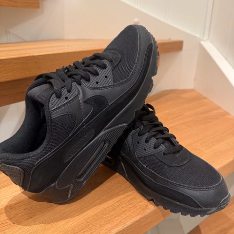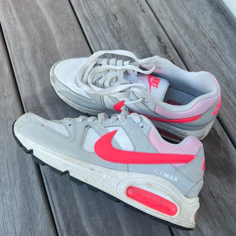 Nike Air Max sneakers i størrelse 45. Joggesko i hovedsak hvit med røde og svarte detaljer, synlig Air Max-demping i hælen og kraftig yttersåle i gummi. Overdel i syntetisk materiale og tekstil, med snøring foran og polstret hælkappe og pløse for økt komfort. Passer som fritidssko og til lett trening.