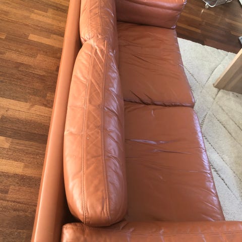 Sofaene er pent brukt, men noen bruksmerker og skinnet har blitt litt løst enkelte steder, noe som er normalt med bruk og kan behandles eller strammes opp ved behov. Ellers fremstår sofaene som hele og fine. Putene kan tas av, noe som gjør rengjøring og vedlikehold enkelt.