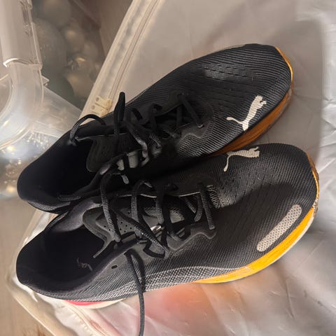 Puma Velocity Nitro løpesko i størrelse 42,5. Modellen er en nøytral løpesko med mellomsåle i Nitro-skum for demping og respons. Overdelen er i pustende mesh med snøring for justerbar passform. Yttersålen har gummipartier for grep på asfalt og lignende underlag. Farge: gul med svarte detaljer. God allround sko!