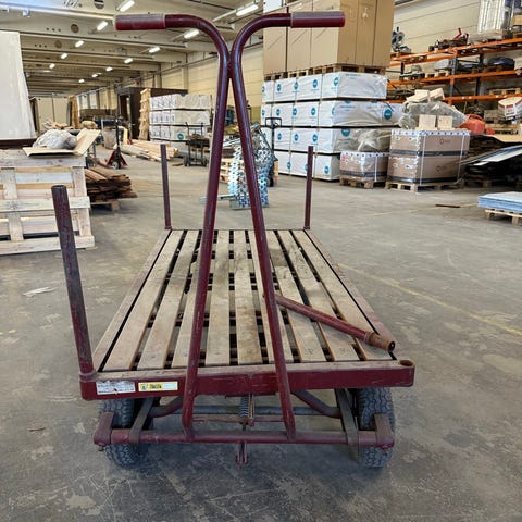 Tralle med flat treplate og hjul. Egnet til transport og flytting av ulike gjenstander på jevnt underlag, for eksempel i verksted, lager eller garasje. Trallen har håndtak i den ene enden for enklere manøvrering.