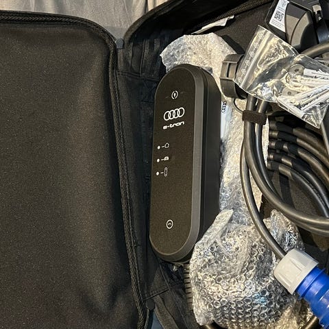 Audi ladekabel adapter for elbil-lading. Adapteren har blå 3-pols industrikontakt (CEE) på den ene siden og kjøretøyspesifikk kontakt på den andre. Merkingen viser 32A / 250V.