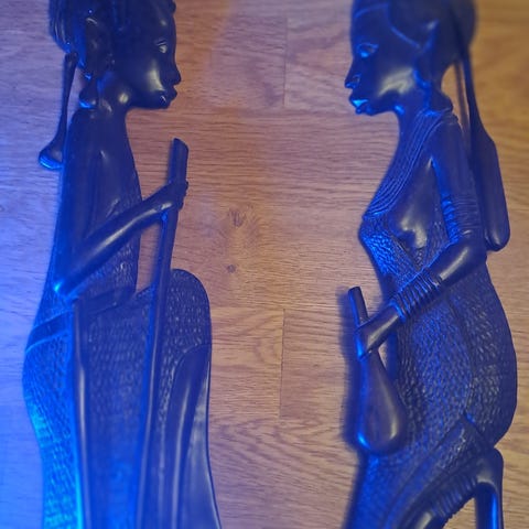 Ukjent merke treskulpturer i mørkebrunt tre.