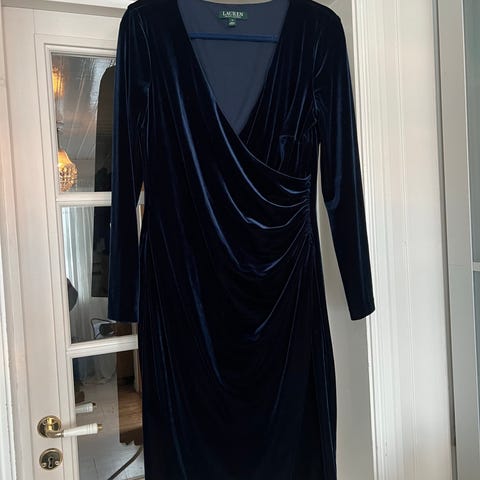 Ellos festkjole i størrelse 42 for dame. Kjolen er laget i grønn fløyel og har lange ermer. Den har omslagseffekt foran og markert midje. Passer som penkjole til selskap og andre anledninger der man ønsker en velkledd stil.