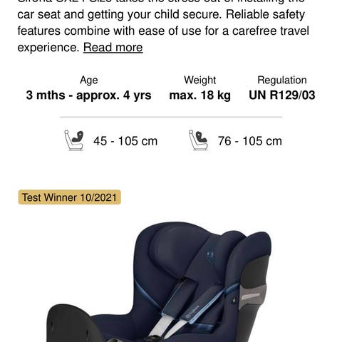 Setet er egnet for barn innenfor vekt- og høydeområdet som tilsvarer størrelse 18 for Cybex-barneseter. Det monteres i bilens baksete og er beregnet for bruk med bilens festepunkter og støttebenet som vist på bildene. Alle funksjoner og innstillinger bør kontrolleres og tilpasses barnet før bruk, i tråd med produsentens anvisninger.
