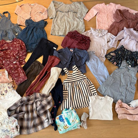 Klespakke med mesteparten i str 110/116, et par plagg i str 98/104: