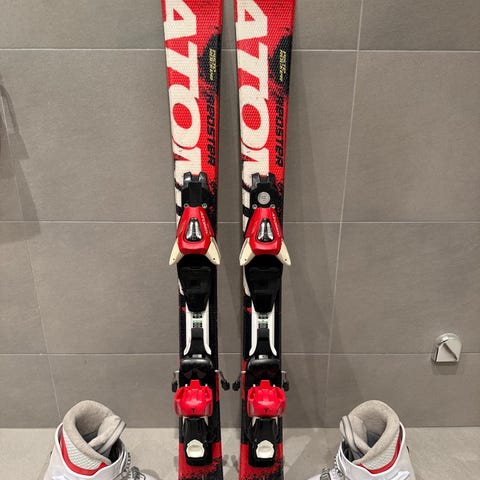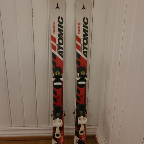 Atomic Race 7 alpinski med bindinger i fargene rød, hvit og svart.