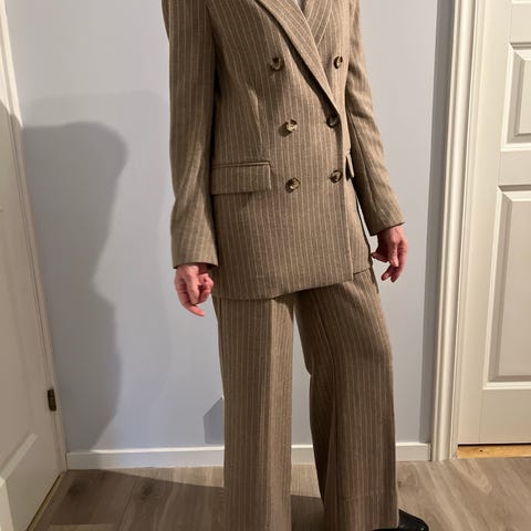 Pen stripet dress. Tynne striper i brun/orange. Gullknapper. Lommer foran som ikke er åpnet. En brystlomme. Størrelse 36. Innermål på bukseben er 73cm. Bukseben med splitt nede og bredde nederst er 13,5cm.