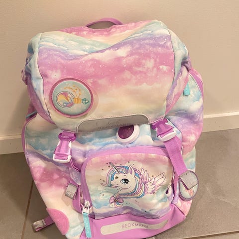 Selger nydelig ryggsekk fra Beckmann med enhjørningmotiv. Den har noen små bruksmerker, men ingen som er sjenerende. Ingen hull. Regntrekket er borte. Mye god bruk igjen. Pris for en ny sekk er 1099kr.