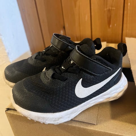 Nike joggesko for barn, unisex. Skoene er svarte med hvit Nike-logo på siden og lys kant rundt åpningen. De har to borrelåsstropper over vristen for enkel av- og påkledning. Myk polstring rundt ankelåpningen gir ekstra komfort. Passer til hverdagsbruk og lek både inne og ute, avhengig av størrelse og behov.