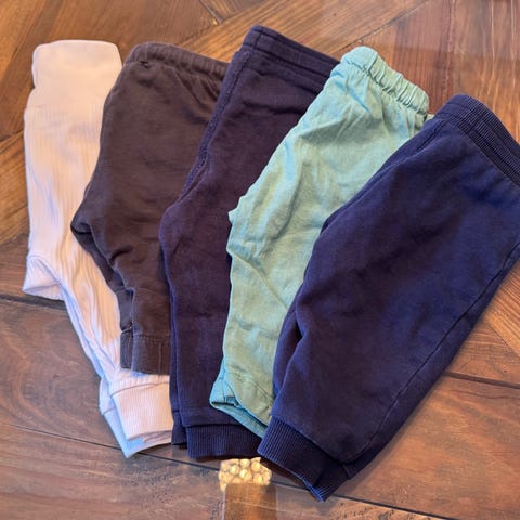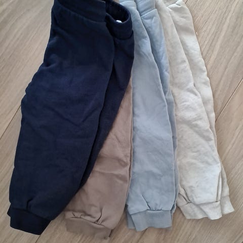 5 bukser fra Cubus, str 80. Den ene beige buksen har noen flekker. Ikke forsøkt fjernet.