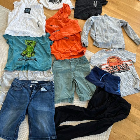 gutteklær pakke i størrelse 164, flerfarget. Pakken inneholder ulike plagg til gutt, blant annet genser med motiv fra Disney butikken i London og bukser i forskjellige farger. Klærne passer til barn i størrelse 164 og neste str etter det og kan brukes til hverdags og fritid. Materiale er ikke spesifisert på alle plagg, men består typisk av myke tekstiler egnet for barneklær.