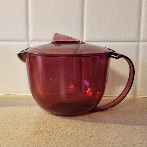 Tupperware MicroCook kanne i blå plast. Kannen har håndtak, helletut og tilhørende lokk. Egnet til tilberedning, oppvarming og servering av mat og væsker. Laget i varmebestandig plast som kan brukes i mikrobølgeovn i henhold til produsentens anvisninger. Passer til bruk på kjøkkenet til daglig matlaging og oppbevaring.