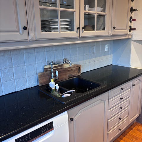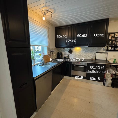 Kjøkken fra Huseby selges på grunn av oppussing. Kjøkkenet er fra 2006. Innredningen hadde opprinnelig hvitmalte fronter, men ble malt sort i 2019. Det er litt bruksmerker i form av "avflasset" maling noen steder. Dette kan enkelt fikses med litt maling. Benkeplaten er laminat. Det er en egen "seksjon" på kjøkkenet med plass til kjøleskap og mikrobølgeovn. Kjøkkenet er av god kvalitet og det er mye bruk igjen!