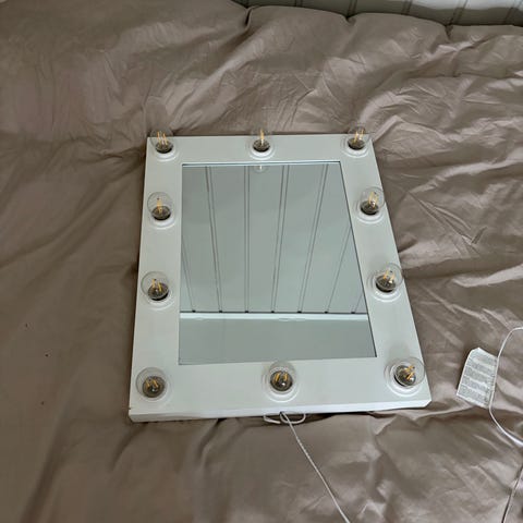 Stående, roterbart sminkespeil med dimbar belysning og avtagbart magnetisk forstørrelsesspeil som kan festes til det store speilet.