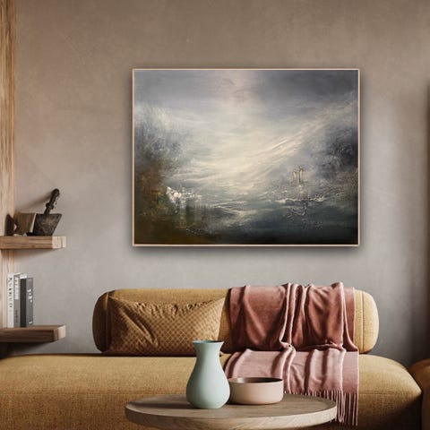 Abstrakt maleri 100x100 cm i lekre delikate farger som smelter sammen