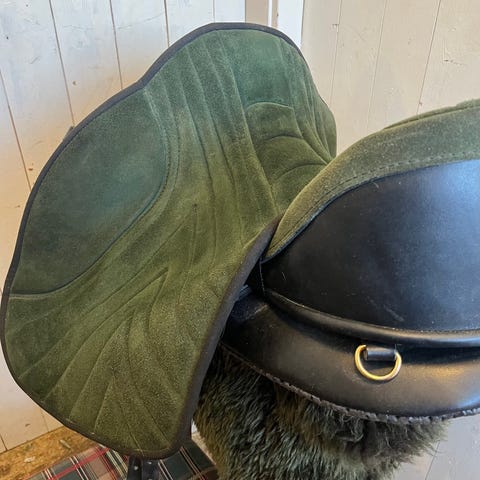Allroundsal i svart lær med setestørrelse 15". Salen har dype knestøtter og flere festeringer til utstyr. Undersiden er polstret for å ligge stabilt på hestens rygg. På bildene følger det med stigbøyler, stigbøyleremmer, salgjord og blå schabrak. Egner seg til en rund ponni med lite manke😊🦄