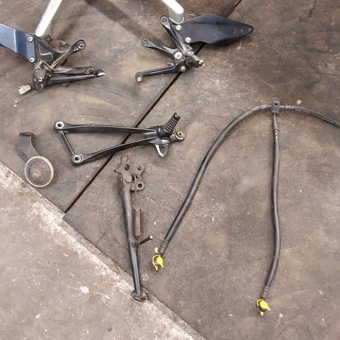 Diverse MC deler. Pakken inneholder blant annet oransje blinklys med ledninger, elektroniske styrebokser/tenningsmoduler med kabelnett, luftfilter- eller luftboksdeler i plast samt ulike metall- og plastdeler til fot- eller girmekanisme og beskyttelsesbøyle. Delene kan brukes som reservedeler eller til prosjekt på motorsykkel der tilsvarende komponenter trengs. Nærmere spesifikasjoner som eksakt modelltilhørighet er ikke angitt og bør kontrolleres mot egen MC før bruk. NB seges kun samlet, har også en pent brukt Honda cbx prolink 1980 mod. Tlf: 932 03 883 Rissa, Indre Fosen Kommune.