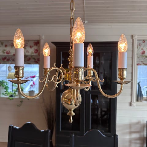 Pen, femarmet lysekrone fra Høvik selges. Pærer for dimming er inkludert. Sendes ikke.
