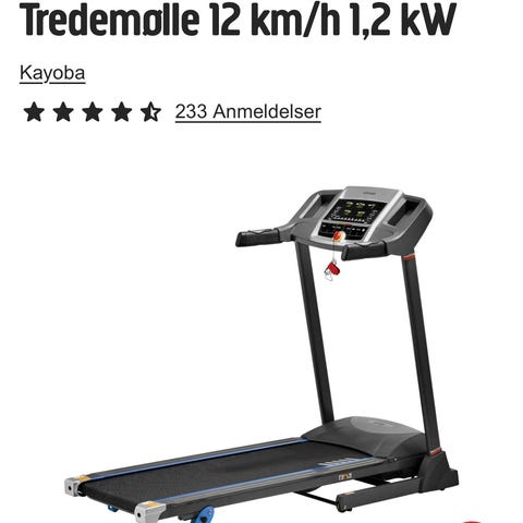 Kayoba tredemølle i sammenleggbar utførelse. Tredemøllen har elektronisk konsoll med display og betjeningsknapper for start, stopp og justering. Løpebåndet kan felles opp for å spare plass ved lagring. Egnet til innendørs kondjonstrening og gange eller lett løp hjemme.