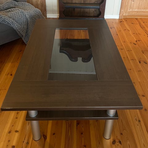 Solid, pent brukt sofabord med glassplate og trehylle