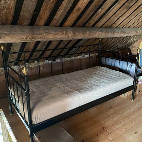 Seng i metall med svart ramme og dekorative detaljer på hode- og fotende. Sengen har ribbebunn i tre. Passer som enkeltseng på soverom, gjesterom eller hybel.