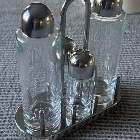 Selger et vintage Alessi '5070 Condiment Set'. Dette kryddersettet ble designet av Ettore Sottsass i 1978. Laget i rustfritt stål og solid glass. Egnet til oppbevaring og servering av olje, eddik, balsamico og andre oljer, samt salt, pepper eller andre tørre krydder.