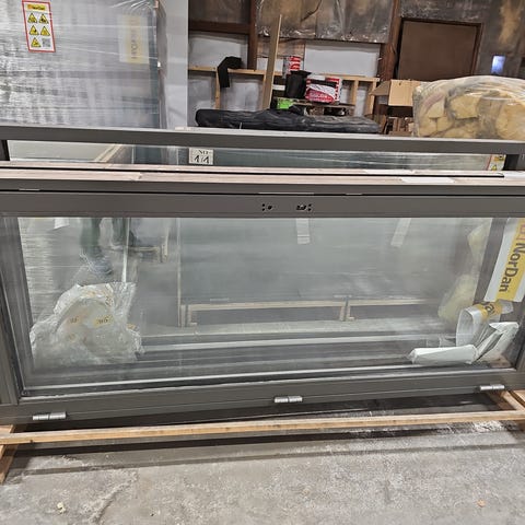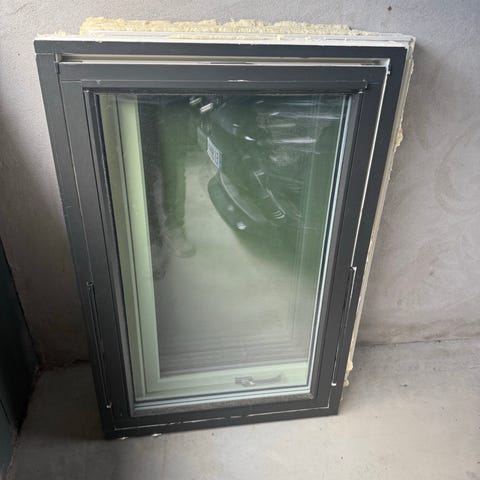 H-vinduet Bauge aluminiumsvindu i RAL 7016 utvendig, hvitt treverk innvendig. Selvrensende. Mangler åpner.