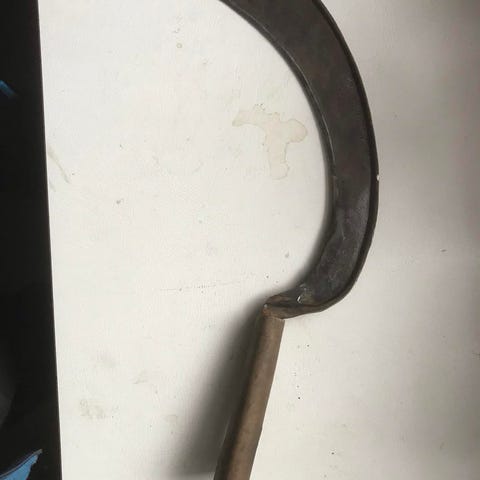 Lauvkniv med treskaft. Kniven har buet blad med krokformet spiss og rett treskaft. Egnet som håndverktøy til grovere skjære- eller huggearbeid der krokformet blad er praktisk. Lengde 35 cm