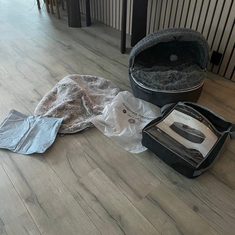 Klore stativ og tilbehør til katt i grå farger. Pakken inneholder et større klore stativ med flere nivåer, hule, ligge plattformer, hengekøye og klore flater, samt et frittstående klore møbel med buet ligge flate. I tillegg følger det med en rund, langhåret kattepute i grått og flere seler og bånd til katt. Utstyret er egnet for innendørs bruk til katt for lek, kloring, hvile og tur. Til bil tur