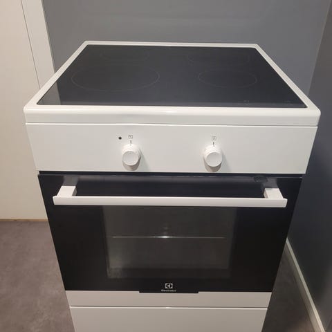 Komfyren er en frittstående elektrisk modell med stekeovn og platetopp. Den har fire betjeningsbrytere på fronten og stekeovn med glassdør.