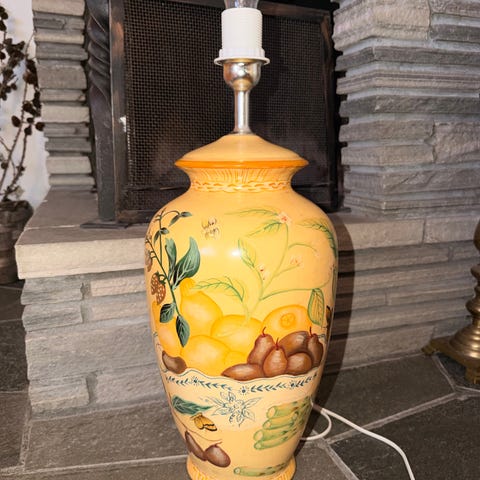 Fargerik lampe med dekorativt mønster og lys skjerm. Små «skader» på skjermen ( se bilde «