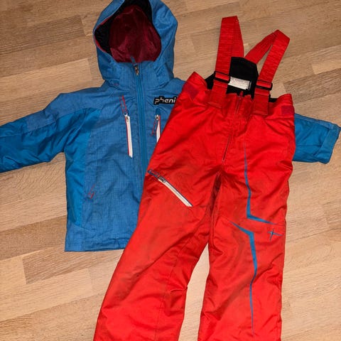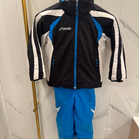 Phenix skidress bestående av jakke og bukse. Jakken er blå med hette, glidelås og flere lommer, samt lyse og mørke kontrastfelt. Buksen er svart med justerbar midje ,rette ben og seler . Sett egnet som yttertøy til bruk ute eller som en flott alpindress