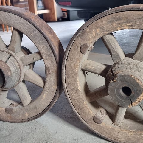 Vognhjul i tre. Hjulene har eiker og metallring ytterst. Egner seg som dekor, rekvisitt eller til restaurering av eldre vognutstyr.