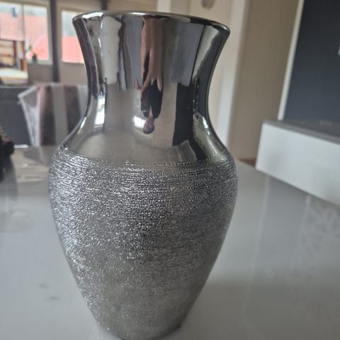 Vase høyde 23 cm, med mørkebrunt/ sort og grått mønster.