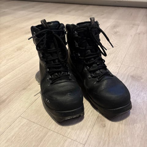 Alfa skisko i svart lær. Klassisk skomodell med høyt skaft og snøring foran. BC binding. Kjøpt for ti år siden, lite brukt. Myk i læret. Ikke stiv slik nye Alfa er. Jevnlig behandlet med minkolje. Dessverre blitt for små. Str 39.