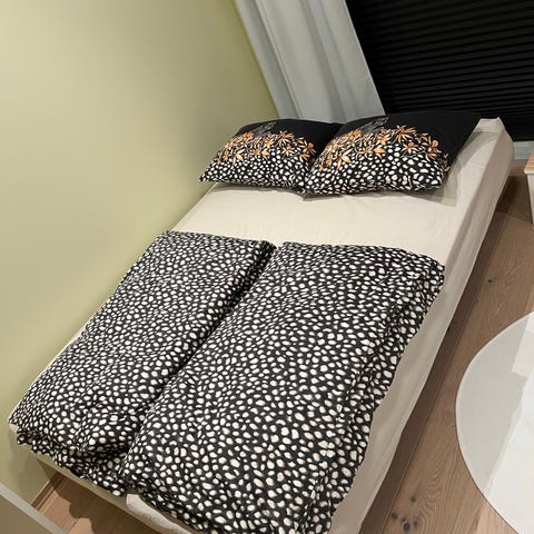 Pent brukt sovesofa fra det danske merket Innovation Living, kjøpt brukt for to år siden. Svært lite brukt, tidligere eier hadde nesten ikke brukt den heller. Har fått gode tilbakemeldinger fra gjester om at den er god å ligge på☺️ ryggen kan justeres ved bruk som sofa (se bilder), og hodeenden kan også justeres ved bruk som seng (se bilde fra produsenten). Tror fargen heter "Elegance Green". Målene som utslått seng er 110x200cm.