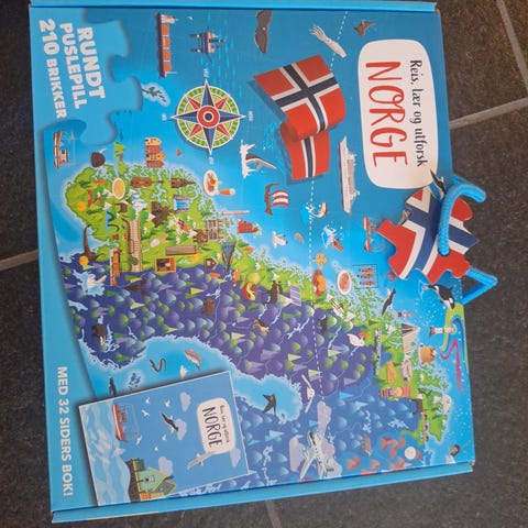 Rundt puslespill med 210 store og solide brikker og 32 siders bok - Reis, lær og utforsk Norge - diameter på 70 cm - med motiv av et Norgeskart. Puslespillet er komplett og er svært pent brukt og har brikker uten skader.