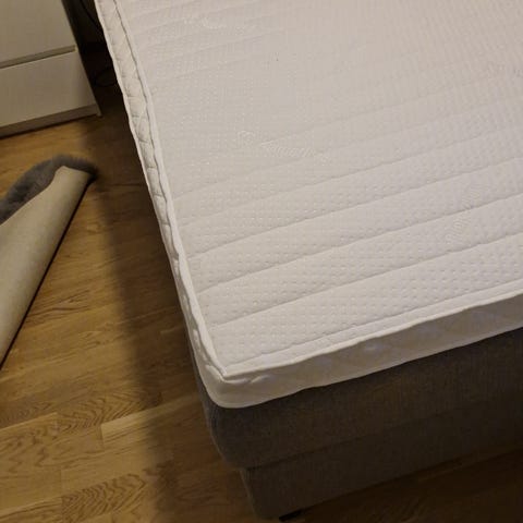 Madrassen har noe vanlig bruksslitasje (se bilde), men fungerer fint og er fortsatt god å ligge på.