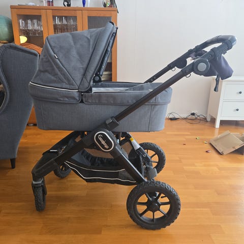 Emmaljunga barnevogn i kombiløsning med både liggedel og sittedel. Vognen har mørk blå tekstil og sort understell med fire hjul. Liggedelen har polstret innside og kalesje med oppbrettbar solskjerm. Sittedelen har justerbar rygg, fotstøtte og fempunktssele. Håndtaket er regulerbart, og det er varekurv under vognen. Egnet til bruk fra nyfødt med liggedel og videre som sportsvogn med sittedel.
