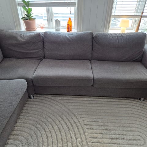 Vendbare puter i sete og rygg. Avtagbart trekk i slitesterkt ullstoff. Kan vaskes på ullprogram. God å sitte i. En katt er involvert i en del synlige tråder, ellers hel og grei.