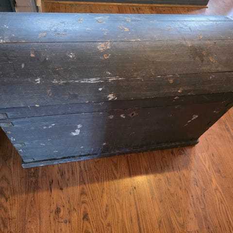 Gammel trekiste i blåmalt utførelse med buet lokk. Kisten har metallbeslag og bærelister, samt enkel ringbeslag på fronten for lukking. Egnet som oppbevaringskiste eller som interiørdetalj. Alderspreg og slitasje i overflate gir et rustikt uttrykk. Må hentes på Nordstrand i Oslo.